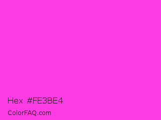 Hex #fe3be4 Color is a light magenta color and the nearest color is Purple Pizzazz #fe4eda. Hex code #fe3be4 and RGB value is rgb(254,59,228). In RGB color space, this color is composed of 100% red, 23% green, 89% blue, In CMYK color space, this color is composed of 0% cyan, 77% magenta, 10% yellow , 0% black , In HSL color space, this color has a hue angle of 308° , 99% saturation and 61% lightness.