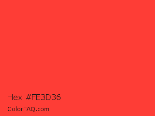 Hex #fe3d36 Color is a normal red color and the nearest color is Red Orange #ff3f34. Hex code #fe3d36 and RGB value is rgb(254,61,54). In RGB color space, this color is composed of 100% red, 24% green, 21% blue, In CMYK color space, this color is composed of 0% cyan, 76% magenta, 79% yellow , 0% black , In HSL color space, this color has a hue angle of 2° , 99% saturation and 60% lightness.