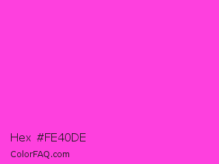 Hex #fe40de Color is a light magenta color and the nearest color is Purple Pizzazz #fe4eda. Hex code #fe40de and RGB value is rgb(254,64,222). In RGB color space, this color is composed of 100% red, 25% green, 87% blue, In CMYK color space, this color is composed of 0% cyan, 75% magenta, 13% yellow , 0% black , In HSL color space, this color has a hue angle of 310° , 99% saturation and 62% lightness.