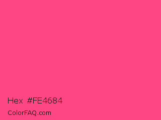 Hex #fe4684 Color is a light rose color and the nearest color is Sasquatch Socks #ff4681. Hex code #fe4684 and RGB value is rgb(254,70,132). In RGB color space, this color is composed of 100% red, 27% green, 52% blue, In CMYK color space, this color is composed of 0% cyan, 72% magenta, 48% yellow , 0% black , In HSL color space, this color has a hue angle of 340° , 99% saturation and 64% lightness.