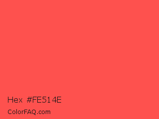Hex #fe514e Color is a light red color and the nearest color is Red Orange #ff5349. Hex code #fe514e and RGB value is rgb(254,81,78). In RGB color space, this color is composed of 100% red, 32% green, 31% blue, In CMYK color space, this color is composed of 0% cyan, 68% magenta, 69% yellow , 0% black , In HSL color space, this color has a hue angle of 1° , 99% saturation and 65% lightness.