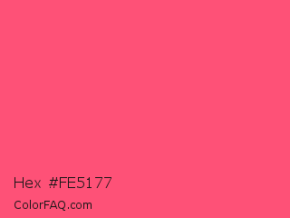 Hex #fe5177 Color is a light red color and the nearest color is Fiery Rose #ff5470. Hex code #fe5177 and RGB value is rgb(254,81,119). In RGB color space, this color is composed of 100% red, 32% green, 47% blue, In CMYK color space, this color is composed of 0% cyan, 68% magenta, 53% yellow , 0% black , In HSL color space, this color has a hue angle of 347° , 99% saturation and 66% lightness.