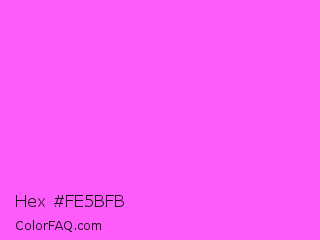Hex #fe5bfb Color is a light magenta color and the nearest color is Pink Flamingo Crayola #ff66ff. Hex code #fe5bfb and RGB value is rgb(254,91,251). In RGB color space, this color is composed of 100% red, 36% green, 98% blue, In CMYK color space, this color is composed of 0% cyan, 64% magenta, 1% yellow , 0% black , In HSL color space, this color has a hue angle of 301° , 99% saturation and 68% lightness.