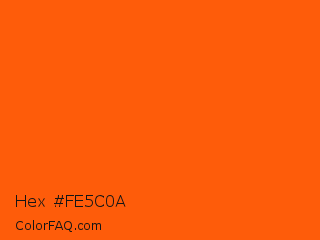 Hex #fe5c0a Color is a normal orange color and the nearest color is Vivid Orange #ff5f00. Hex code #fe5c0a and RGB value is rgb(254,92,10). In RGB color space, this color is composed of 100% red, 36% green, 4% blue, In CMYK color space, this color is composed of 0% cyan, 64% magenta, 96% yellow , 0% black , In HSL color space, this color has a hue angle of 20° , 99% saturation and 52% lightness.
