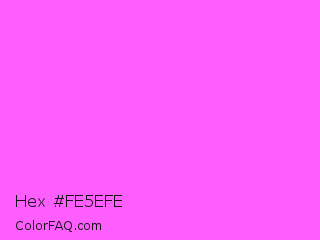 Hex #fe5efe Color is a light magenta color and the nearest color is Pink Flamingo Crayola #ff66ff. Hex code #fe5efe and RGB value is rgb(254,94,254). In RGB color space, this color is composed of 100% red, 37% green, 100% blue, In CMYK color space, this color is composed of 0% cyan, 63% magenta, 0% yellow , 0% black , In HSL color space, this color has a hue angle of 300° , 99% saturation and 68% lightness.