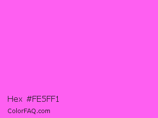 Hex #fe5ff1 Color is a light magenta color and the nearest color is Pink Flamingo Crayola #ff66ff. Hex code #fe5ff1 and RGB value is rgb(254,95,241). In RGB color space, this color is composed of 100% red, 37% green, 95% blue, In CMYK color space, this color is composed of 0% cyan, 63% magenta, 5% yellow , 0% black , In HSL color space, this color has a hue angle of 305° , 99% saturation and 68% lightness.