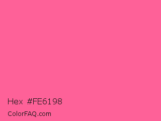Hex #fe6198 Color is a light rose color and the nearest color is French Pink #fd6c9e. Hex code #fe6198 and RGB value is rgb(254,97,152). In RGB color space, this color is composed of 100% red, 38% green, 60% blue, In CMYK color space, this color is composed of 0% cyan, 62% magenta, 40% yellow , 0% black , In HSL color space, this color has a hue angle of 339° , 99% saturation and 69% lightness.
