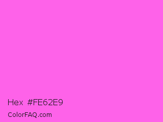 Hex #fe62e9 Color is a light magenta color and the nearest color is Pink Flamingo Crayola #ff66ff. Hex code #fe62e9 and RGB value is rgb(254,98,233). In RGB color space, this color is composed of 100% red, 38% green, 91% blue, In CMYK color space, this color is composed of 0% cyan, 61% magenta, 8% yellow , 0% black , In HSL color space, this color has a hue angle of 308° , 99% saturation and 69% lightness.
