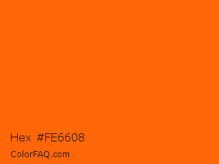 Hex #fe6608 Color is a normal orange color and the nearest color is Blaze Orange #ff6600. Hex code #fe6608 and RGB value is rgb(254,102,8). In RGB color space, this color is composed of 100% red, 40% green, 3% blue, In CMYK color space, this color is composed of 0% cyan, 60% magenta, 97% yellow , 0% black , In HSL color space, this color has a hue angle of 23° , 99% saturation and 51% lightness.