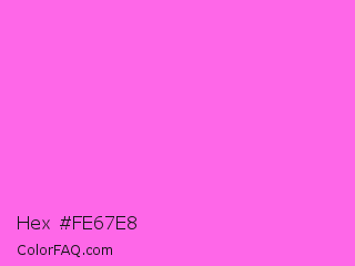 Hex #fe67e8 Color is a light magenta color and the nearest color is Pink Flamingo Crayola #ff66ff. Hex code #fe67e8 and RGB value is rgb(254,103,232). In RGB color space, this color is composed of 100% red, 40% green, 91% blue, In CMYK color space, this color is composed of 0% cyan, 59% magenta, 9% yellow , 0% black , In HSL color space, this color has a hue angle of 309° , 99% saturation and 70% lightness.
