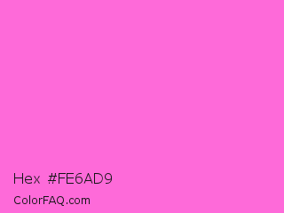 Hex #fe6ad9 Color is a light magenta color and the nearest color is Rose Pink #ff66cc. Hex code #fe6ad9 and RGB value is rgb(254,106,217). In RGB color space, this color is composed of 100% red, 42% green, 85% blue, In CMYK color space, this color is composed of 0% cyan, 58% magenta, 15% yellow , 0% black , In HSL color space, this color has a hue angle of 315° , 99% saturation and 71% lightness.