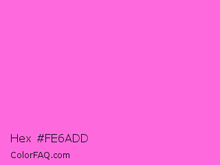 Hex #fe6add Color is a light magenta color and the nearest color is Rose Pink #ff66cc. Hex code #fe6add and RGB value is rgb(254,106,221). In RGB color space, this color is composed of 100% red, 42% green, 87% blue, In CMYK color space, this color is composed of 0% cyan, 58% magenta, 13% yellow , 0% black , In HSL color space, this color has a hue angle of 313° , 99% saturation and 71% lightness.