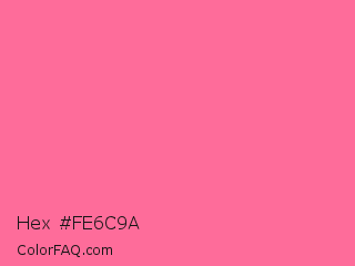 Hex #fe6c9a Color is a light rose color and the nearest color is French Pink #fd6c9e. Hex code #fe6c9a and RGB value is rgb(254,108,154). In RGB color space, this color is composed of 100% red, 42% green, 60% blue, In CMYK color space, this color is composed of 0% cyan, 57% magenta, 39% yellow , 0% black , In HSL color space, this color has a hue angle of 341° , 99% saturation and 71% lightness.