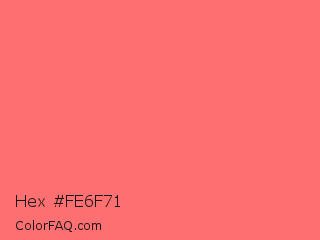 Hex #fe6f71 Color is a light red color and the nearest color is Begonia #fa6e79. Hex code #fe6f71 and RGB value is rgb(254,111,113). In RGB color space, this color is composed of 100% red, 44% green, 44% blue, In CMYK color space, this color is composed of 0% cyan, 56% magenta, 56% yellow , 0% black , In HSL color space, this color has a hue angle of 359° , 99% saturation and 72% lightness.