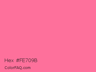 Hex #fe709b Color is a light rose color and the nearest color is French Pink #fd6c9e. Hex code #fe709b and RGB value is rgb(254,112,155). In RGB color space, this color is composed of 100% red, 44% green, 61% blue, In CMYK color space, this color is composed of 0% cyan, 56% magenta, 39% yellow , 0% black , In HSL color space, this color has a hue angle of 342° , 99% saturation and 72% lightness.