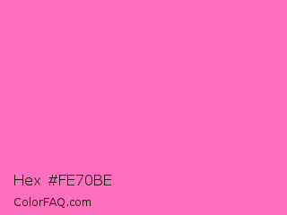 Hex #fe70be Color is a light magenta color and the nearest color is Hot Pink #ff69b4. Hex code #fe70be and RGB value is rgb(254,112,190). In RGB color space, this color is composed of 100% red, 44% green, 75% blue, In CMYK color space, this color is composed of 0% cyan, 56% magenta, 25% yellow , 0% black , In HSL color space, this color has a hue angle of 327° , 99% saturation and 72% lightness.