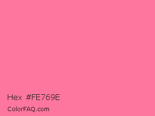 Hex #fe769e Color is a light rose color and the nearest color is French Pink #fd6c9e. Hex code #fe769e and RGB value is rgb(254,118,158). In RGB color space, this color is composed of 100% red, 46% green, 62% blue, In CMYK color space, this color is composed of 0% cyan, 54% magenta, 38% yellow , 0% black , In HSL color space, this color has a hue angle of 342° , 99% saturation and 73% lightness.