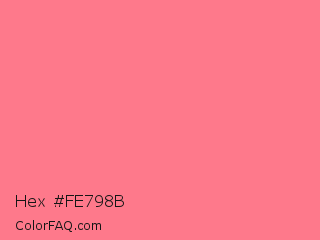 Hex #fe798b Color is a light red color and the nearest color is Froly #f57584. Hex code #fe798b and RGB value is rgb(254,121,139). In RGB color space, this color is composed of 100% red, 47% green, 55% blue, In CMYK color space, this color is composed of 0% cyan, 52% magenta, 45% yellow , 0% black , In HSL color space, this color has a hue angle of 352° , 99% saturation and 74% lightness.