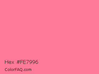 Hex #fe7996 Color is a light red color and the nearest color is French Pink #fd6c9e. Hex code #fe7996 and RGB value is rgb(254,121,150). In RGB color space, this color is composed of 100% red, 47% green, 59% blue, In CMYK color space, this color is composed of 0% cyan, 52% magenta, 41% yellow , 0% black , In HSL color space, this color has a hue angle of 347° , 99% saturation and 74% lightness.