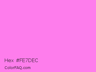 Hex #fe7dec Color is a light magenta color and the nearest color is Light Fuchsia Pink #f984ef. Hex code #fe7dec and RGB value is rgb(254,125,236). In RGB color space, this color is composed of 100% red, 49% green, 93% blue, In CMYK color space, this color is composed of 0% cyan, 51% magenta, 7% yellow , 0% black , In HSL color space, this color has a hue angle of 308° , 98% saturation and 74% lightness.