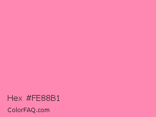 Hex #fe88b1 Color is a light rose color and the nearest color is Tickle Me Pink #fc89ac. Hex code #fe88b1 and RGB value is rgb(254,136,177). In RGB color space, this color is composed of 100% red, 53% green, 69% blue, In CMYK color space, this color is composed of 0% cyan, 46% magenta, 30% yellow , 0% black , In HSL color space, this color has a hue angle of 339° , 98% saturation and 76% lightness.