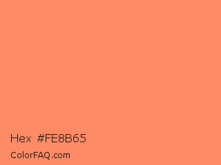 Hex #fe8b65 Color is a light color and the nearest color is Salmon #ff8c69. Hex code #fe8b65 and RGB value is rgb(254,139,101). In RGB color space, this color is composed of 100% red, 55% green, 40% blue, In CMYK color space, this color is composed of 0% cyan, 45% magenta, 60% yellow , 0% black , In HSL color space, this color has a hue angle of 15° , 99% saturation and 70% lightness.