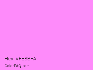 Hex #fe8bfa Color is a light magenta color and the nearest color is Light Fuchsia Pink #f984ef. Hex code #fe8bfa and RGB value is rgb(254,139,250). In RGB color space, this color is composed of 100% red, 55% green, 98% blue, In CMYK color space, this color is composed of 0% cyan, 45% magenta, 2% yellow , 0% black , In HSL color space, this color has a hue angle of 302° , 98% saturation and 77% lightness.