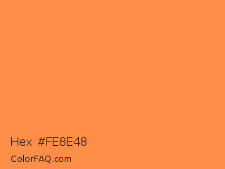 Hex #fe8e48 Color is a light orange color and the nearest color is Mango Tango #ff8243. Hex code #fe8e48 and RGB value is rgb(254,142,72). In RGB color space, this color is composed of 100% red, 56% green, 28% blue, In CMYK color space, this color is composed of 0% cyan, 44% magenta, 72% yellow , 0% black , In HSL color space, this color has a hue angle of 23° , 99% saturation and 64% lightness.