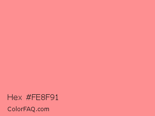 Hex #fe8f91 Color is a light red color and the nearest color is Tulip #ff878d. Hex code #fe8f91 and RGB value is rgb(254,143,145). In RGB color space, this color is composed of 100% red, 56% green, 57% blue, In CMYK color space, this color is composed of 0% cyan, 44% magenta, 43% yellow , 0% black , In HSL color space, this color has a hue angle of 359° , 98% saturation and 78% lightness.