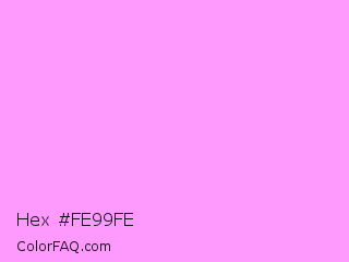 Hex #fe99fe Color is a light magenta color and the nearest color is Rich Brilliant Lavender #f1a7fe. Hex code #fe99fe and RGB value is rgb(254,153,254). In RGB color space, this color is composed of 100% red, 60% green, 100% blue, In CMYK color space, this color is composed of 0% cyan, 40% magenta, 0% yellow , 0% black , In HSL color space, this color has a hue angle of 300° , 98% saturation and 80% lightness.