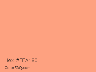 Hex #fea180 Color is a light orange color and the nearest color is Light Salmon #ffa07a. Hex code #fea180 and RGB value is rgb(254,161,128). In RGB color space, this color is composed of 100% red, 63% green, 50% blue, In CMYK color space, this color is composed of 0% cyan, 37% magenta, 50% yellow , 0% black , In HSL color space, this color has a hue angle of 16° , 98% saturation and 75% lightness.