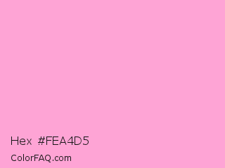 Hex #fea4d5 Color is a very light magenta color and the nearest color is Lavender Pink #fbaed2. Hex code #fea4d5 and RGB value is rgb(254,164,213). In RGB color space, this color is composed of 100% red, 64% green, 84% blue, In CMYK color space, this color is composed of 0% cyan, 35% magenta, 16% yellow , 0% black , In HSL color space, this color has a hue angle of 327° , 98% saturation and 82% lightness.