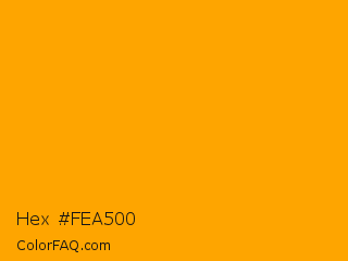 Hex #fea500 Color is a normal orange color and the nearest color is Web Orange #ffa500. Hex code #fea500 and RGB value is rgb(254,165,0). In RGB color space, this color is composed of 100% red, 65% green, 0% blue, In CMYK color space, this color is composed of 0% cyan, 35% magenta, 100% yellow , 0% black , In HSL color space, this color has a hue angle of 39° , 100% saturation and 50% lightness.