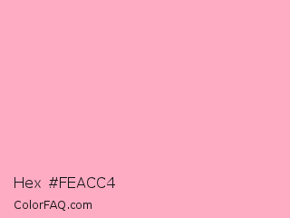Hex #feacc4 Color is a very light rose color and the nearest color is Carnation Pink #ffa6c9. Hex code #feacc4 and RGB value is rgb(254,172,196). In RGB color space, this color is composed of 100% red, 67% green, 77% blue, In CMYK color space, this color is composed of 0% cyan, 32% magenta, 23% yellow , 0% black , In HSL color space, this color has a hue angle of 342° , 98% saturation and 84% lightness.