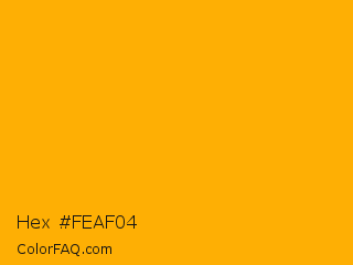 Hex #feaf04 Color is a normal orange color and the nearest color is UCLA Gold #ffb300. Hex code #feaf04 and RGB value is rgb(254,175,4). In RGB color space, this color is composed of 100% red, 69% green, 2% blue, In CMYK color space, this color is composed of 0% cyan, 31% magenta, 98% yellow , 0% black , In HSL color space, this color has a hue angle of 41° , 99% saturation and 51% lightness.