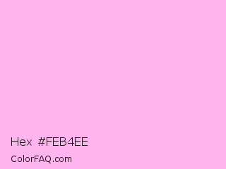 Hex #feb4ee Color is a very light magenta color and the nearest color is Light Hot Pink #ffb3de. Hex code #feb4ee and RGB value is rgb(254,180,238). In RGB color space, this color is composed of 100% red, 71% green, 93% blue, In CMYK color space, this color is composed of 0% cyan, 29% magenta, 6% yellow , 0% black , In HSL color space, this color has a hue angle of 313° , 97% saturation and 85% lightness.