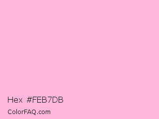Hex #feb7db Color is a very light rose color and the nearest color is Light Hot Pink #ffb3de. Hex code #feb7db and RGB value is rgb(254,183,219). In RGB color space, this color is composed of 100% red, 72% green, 86% blue, In CMYK color space, this color is composed of 0% cyan, 28% magenta, 14% yellow , 0% black , In HSL color space, this color has a hue angle of 330° , 97% saturation and 86% lightness.