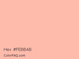 Hex #febbab Color is a very light red color and the nearest color is Melon Crayola #febaad. Hex code #febbab and RGB value is rgb(254,187,171). In RGB color space, this color is composed of 100% red, 73% green, 67% blue, In CMYK color space, this color is composed of 0% cyan, 26% magenta, 33% yellow , 0% black , In HSL color space, this color has a hue angle of 12° , 98% saturation and 83% lightness.