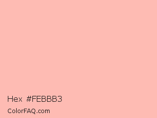 Hex #febbb3 Color is a very light red color and the nearest color is Melon #fdbcb4. Hex code #febbb3 and RGB value is rgb(254,187,179). In RGB color space, this color is composed of 100% red, 73% green, 70% blue, In CMYK color space, this color is composed of 0% cyan, 26% magenta, 30% yellow , 0% black , In HSL color space, this color has a hue angle of 6° , 97% saturation and 85% lightness.