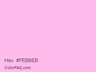 Hex #febbeb Color is a very light magenta color and the nearest color is Light Hot Pink #ffb3de. Hex code #febbeb and RGB value is rgb(254,187,235). In RGB color space, this color is composed of 100% red, 73% green, 92% blue, In CMYK color space, this color is composed of 0% cyan, 26% magenta, 7% yellow , 0% black , In HSL color space, this color has a hue angle of 317° , 97% saturation and 86% lightness.