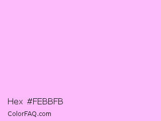 Hex #febbfb Color is a very light magenta color and the nearest color is Electric Lavender #f4bbff. Hex code #febbfb and RGB value is rgb(254,187,251). In RGB color space, this color is composed of 100% red, 73% green, 98% blue, In CMYK color space, this color is composed of 0% cyan, 26% magenta, 1% yellow , 0% black , In HSL color space, this color has a hue angle of 303° , 97% saturation and 86% lightness.