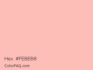 Hex #febeb8 Color is a very light red color and the nearest color is Melon #fdbcb4. Hex code #febeb8 and RGB value is rgb(254,190,184). In RGB color space, this color is composed of 100% red, 75% green, 72% blue, In CMYK color space, this color is composed of 0% cyan, 25% magenta, 28% yellow , 0% black , In HSL color space, this color has a hue angle of 5° , 97% saturation and 86% lightness.