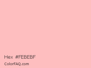 Hex #febebf Color is a very light red color and the nearest color is Your Pink #ffc3c0. Hex code #febebf and RGB value is rgb(254,190,191). In RGB color space, this color is composed of 100% red, 75% green, 75% blue, In CMYK color space, this color is composed of 0% cyan, 25% magenta, 25% yellow , 0% black , In HSL color space, this color has a hue angle of 359° , 97% saturation and 87% lightness.