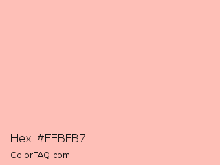 Hex #febfb7 Color is a very light red color and the nearest color is Melon #fdbcb4. Hex code #febfb7 and RGB value is rgb(254,191,183). In RGB color space, this color is composed of 100% red, 75% green, 72% blue, In CMYK color space, this color is composed of 0% cyan, 25% magenta, 28% yellow , 0% black , In HSL color space, this color has a hue angle of 7° , 97% saturation and 86% lightness.