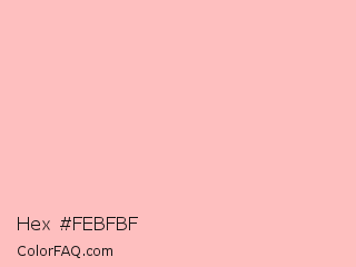 Hex #febfbf Color is a very light red color and the nearest color is Your Pink #ffc3c0. Hex code #febfbf and RGB value is rgb(254,191,191). In RGB color space, this color is composed of 100% red, 75% green, 75% blue, In CMYK color space, this color is composed of 0% cyan, 25% magenta, 25% yellow , 0% black , In HSL color space, this color has a hue angle of 0° , 97% saturation and 87% lightness.