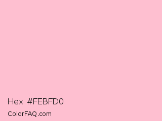 Hex #febfd0 Color is a very light rose color and the nearest color is Bubble Gum #ffc1cc. Hex code #febfd0 and RGB value is rgb(254,191,208). In RGB color space, this color is composed of 100% red, 75% green, 82% blue, In CMYK color space, this color is composed of 0% cyan, 25% magenta, 18% yellow , 0% black , In HSL color space, this color has a hue angle of 344° , 97% saturation and 87% lightness.
