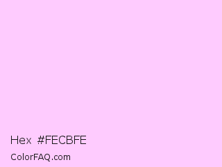 Hex #fecbfe Color is a very light magenta color and the nearest color is Shampoo #ffcff1. Hex code #fecbfe and RGB value is rgb(254,203,254). In RGB color space, this color is composed of 100% red, 80% green, 100% blue, In CMYK color space, this color is composed of 0% cyan, 20% magenta, 0% yellow , 0% black , In HSL color space, this color has a hue angle of 300° , 96% saturation and 90% lightness.
