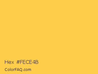 Hex #fece4b Color is a light orange color and the nearest color is Bright Sun #fed33c. Hex code #fece4b and RGB value is rgb(254,206,75). In RGB color space, this color is composed of 100% red, 81% green, 29% blue, In CMYK color space, this color is composed of 0% cyan, 19% magenta, 70% yellow , 0% black , In HSL color space, this color has a hue angle of 44° , 99% saturation and 65% lightness.