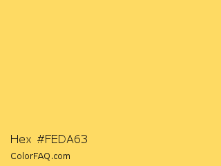 Hex #feda63 Color is a light yellow color and the nearest color is Goldenrod #fcd667. Hex code #feda63 and RGB value is rgb(254,218,99). In RGB color space, this color is composed of 100% red, 85% green, 39% blue, In CMYK color space, this color is composed of 0% cyan, 14% magenta, 61% yellow , 0% black , In HSL color space, this color has a hue angle of 46° , 99% saturation and 69% lightness.