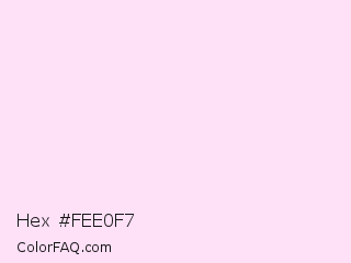 Hex #fee0f7 Color is a very light magenta color and the nearest color is Pink Lace #ffddf4. Hex code #fee0f7 and RGB value is rgb(254,224,247). In RGB color space, this color is composed of 100% red, 88% green, 97% blue, In CMYK color space, this color is composed of 0% cyan, 12% magenta, 3% yellow , 0% black , In HSL color space, this color has a hue angle of 314° , 94% saturation and 94% lightness.